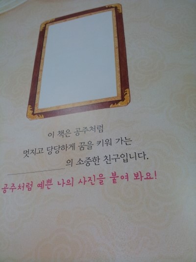그 밑에는 '이 책은 공주처럼 멋지고 당당하게 꿈을 키워가는 _______의 소중한 친구입니다.'라고 쓰여 있다.