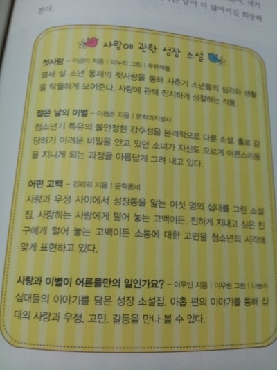 연애를 시작하는 십대에게, 아름답게 헤어지는 법, 첫사랑, 짝사랑, 연상 연하 커플, 습관성 연애, 모두가 반대하는 사랑에 대한 사랑 얘기와