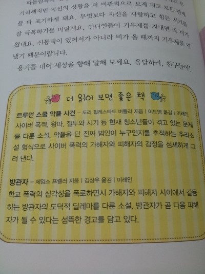 - 따돌림과의 전쟁은 자신과의 싸움이기도 해요. 우울하고 무기력해지면 자신의 상황을 더 비관적으로 보게 되고 모든 관계를 다 포기하게 돼요. 무엇보다 자신을 사랑하고 힘든 시기를 잘 극복하기를 바랄게요.