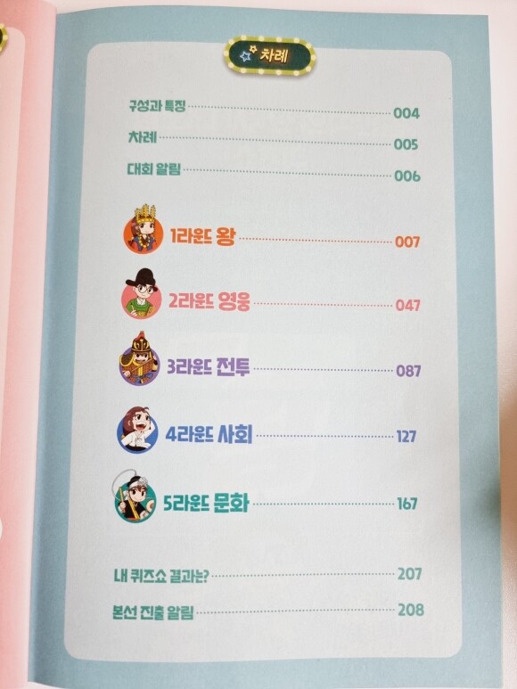설민석의 한국사 대모험 퀴즈쇼 본선에서는 왕, 영웅, 전투, 사회, 문화 5개의 라운드로 나뉘어여 있어서 주제별로 역사퀴를 풀면 한국사를 배울 수 있어요.