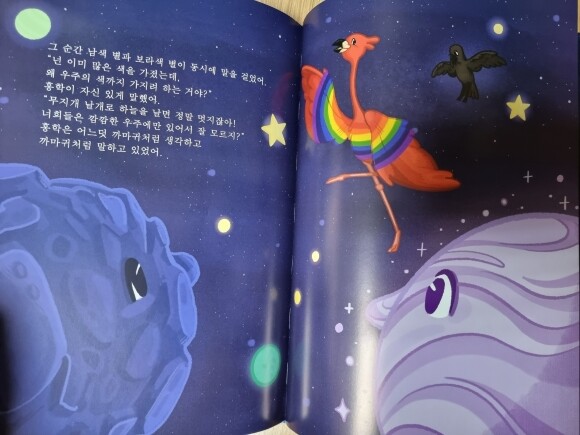 한가지 색을 가지고 있던 홍학의 눈에 무지개는 정말 아름다워보였는데요.
