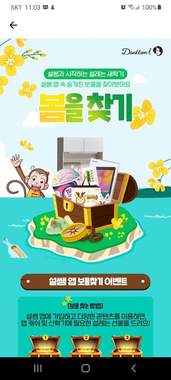 설땜앱에서는 설쌤과 함께하는 설레는 새학기 설쌤 앱 속에 숨겨진 보물차기 이벤트가 진행중인데요.