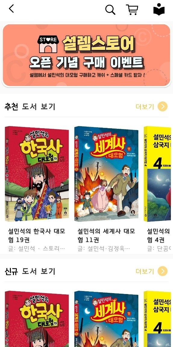 설샘 스토어 오픈기념 신간 이벤트로 세계사11권, 설민석의 한국사 대모험19권, 삼국지5권을 구매시