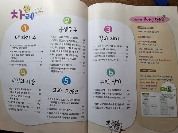 백점 수학 2학년2학기에서는 네자리수, 곱셈구구, 길이재기, 시각과시간, 표와그래크, 규칙찾기까지 배워 볼 수 있는데요.