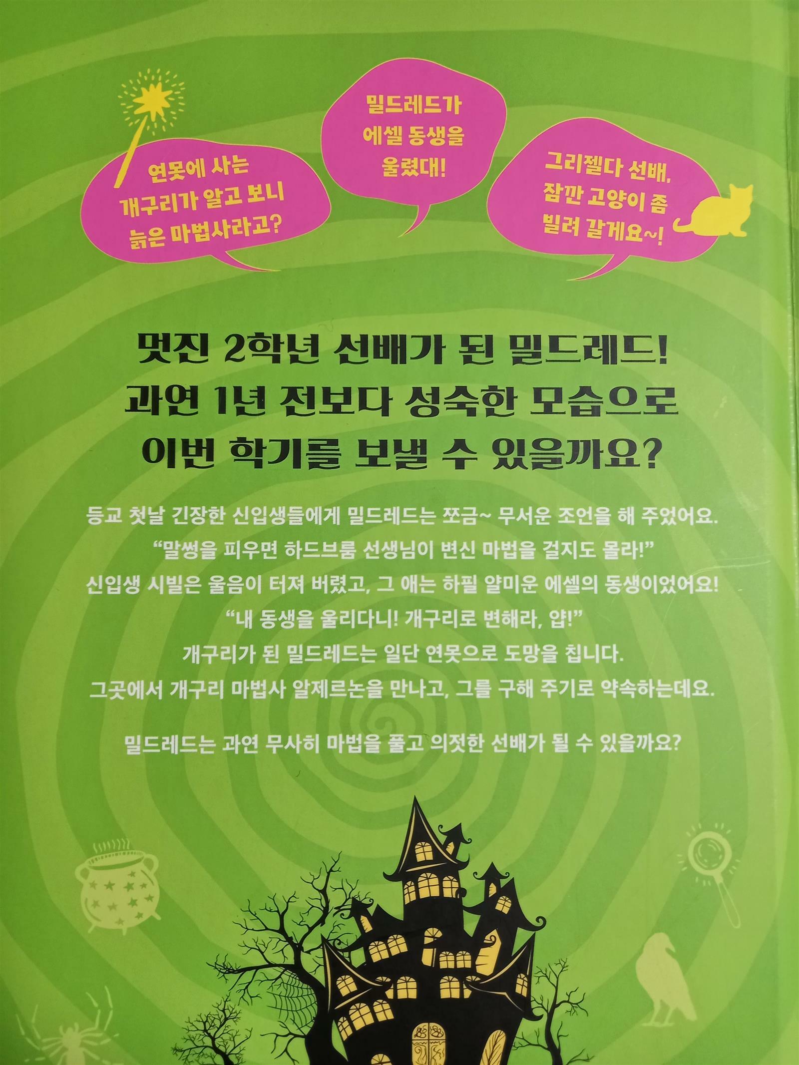 꼴찌마녀였던 밀드레드가 이제 2학년이 되었어요. 2학년이 된 밀드레드가 이젠 의젓하게 학교생활을 할 수 있을까요? 또다른 어떤 사건이 기다리고 있을지 흥미진진한데요. 새학기가 시작되고 에니스와 모드와 함께 하는데요. 낮설어서 울고 있는 1학년을 보게 되고, 달래주려다가 오히려 겁을 주게 된 밀드레드 근데 하필 그 학생이 에셀의 동생이라니... 근데 뜻밖의 일이 생기게 되는데, 밀드레드가 개구리로 변한 것. 누가 그렇게 만든것인지 말안해도 누군지 알것 같음... 개구리로 변한 밀드레드는 또다른 마법에 걸린 개구리를 만나게 되는데요. 친구들은 개구리가 밀드레드인걸 눈치채고, 에셀은 밀드레드를 원래의 모습으로 돌려놓는다 잠시 미안한 감정을 가진 에셀은 하드브룸 선생님을 보자 고자질 한다. 하지만 미쳐 돌아오지 못한 투명발로 사실이 발각된다. 선생님은 둘에게 잘못된 점을 이야기하고 반성문 쓰게 한다. 마법으로 친구를 동물로 변신시킨것 지어낸 이야기로 1학년 아이들 겁을 준 것 사실 선생님이 무서워도 규칙에 따라서 잘잘못을 확실하게 애기해주는 하드브룸 선생님이 학교에 필요하다고 생각한다. 개구리가 된 알제르논도 마법 풀리고 밀드레드도 좀 더 성숙해진것 같다. 점점 학교에 적응해가는 밀드레드가 다음의 어떤 모습이 되어 있을지 성장모습이 궁금하다. 창작동화인 꼴찌마녀 밀드레드3 다음편이 더 기대됩니다. 이 책은 리뷰어스클럽에서 도서를 제공받아 작성된 리뷰입니다 #꼴찌마녀밀드레드3#창작동화#질머피#이지북#리뷰어스클럽#서평이벤트