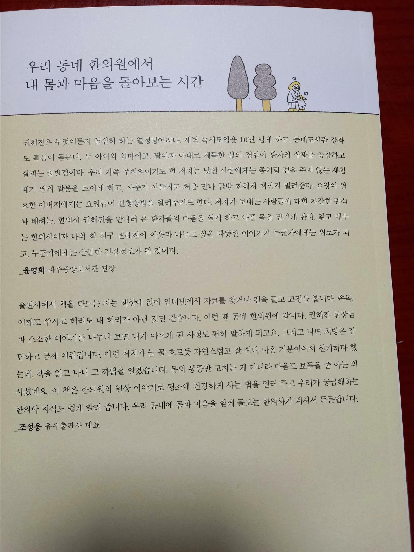 마음까지 살펴주는 우리 동네 한의사 어느 병원에 가면 사무적으로 환자를 대하거나 일상 애기를 하면서 대화를 통해서 환자의 마음까지 살펴주는 의사가 있다. 난 의사는 아니지만, 환자마다 아픈 부위도 다르고 사용하는 처방전도 다르니, 충분한 대화를 통해서 치료를 해야 한다고 생각한다 최근에 이유없이 몸이 이곳저곳 아파서 병원에 갔는데, 갈 때마다 아픈 부위가 바뀐다고 오히려 이상하게 생각하면서 의아해했다. 치료를 받으면서 조금 나아지긴 했지만, 사실 기분이 좋지 않았다. 내가 가는 한의원은 환자와 대화를 많이 한다. 그 따뜻함이 난 참 좋다. 책에 나온것처럼 믿을만한 한의원이 있어서 뭔가 든든하다. 단골 미용실이 있는 것처럼! 책을 읽는 내낸 따스함을 느꼈다. 환자를 가족처럼 아끼는 것이 느껴졌다. 내과적 질환과 외과적 질환등... 자세한 설명과 함께 혈자리나 약에 대해서도 알기쉽게 알려주셔서 좋았다 한약은 바로 효과가 나타나기보다 시간이 걸리기에 지금 당장 이라기보단 시간이 걸린다. 나 역시 학생때 축농증에 알레르기 비염 때문에 한약을 먹었는데, 그때 당시에는 몰랐는데 나중에 좋아졌다. 환자의 신체적 아픔 뿐 아니라 마음까지 살펴주는 우리 동네 한의사 인문책으로 누구나 따뜻한 마음으로 읽을수 있는 책 단순한 의학책을 넘은 도서 이 책은 리뷰어스클럽에서 도서를 제공받아 작성된 리뷰입니다 #우리동네한의사#인문#권해진#리뷰어스클럽#서평이벤트