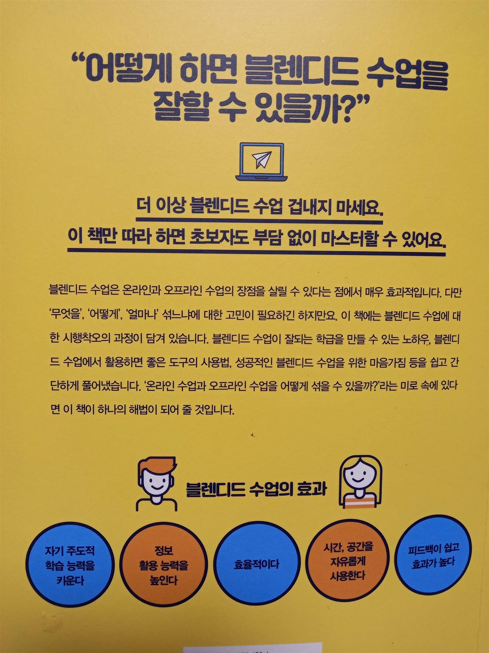 누구나 쉽게 따라할 수 있는 브렌디드 수업의 책에서는 수업에 관한 시행착오부터 성공적으로 블렌디드 수업을 하기 위한 다양한 자료와 도구의 사용법등이 상세하게 나와있다.