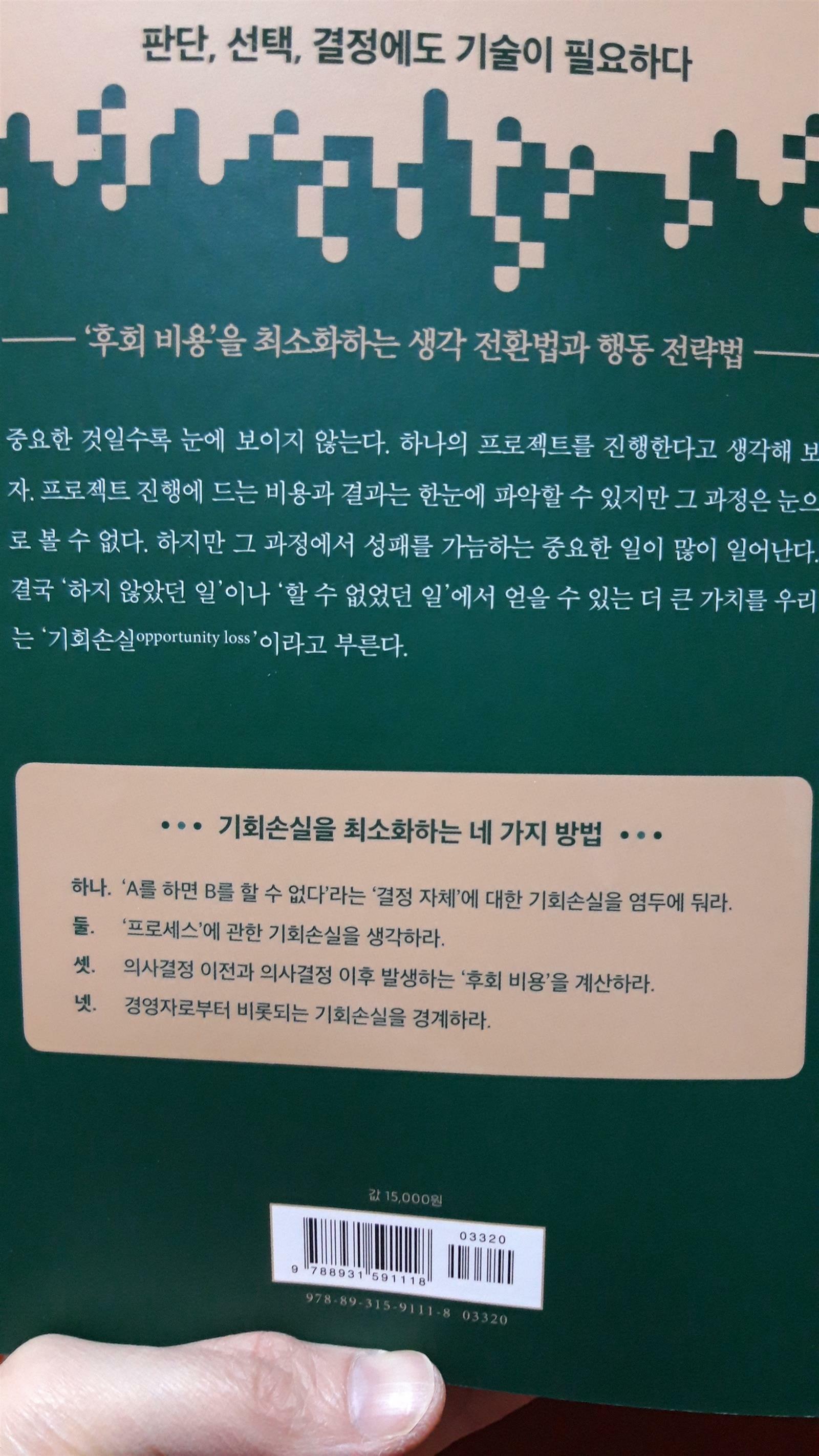 손실을 최소화하고 성과를 높이는 기회손실 제로의 법칙 A안과 B안이 있을때 어느 한 쪽을 선택하면 하나는 잃게 되는데, 어떤것을 선택해야 최적의 선택을 하고, 어떤것을 포기해야 좀 더 나은지 포기하고 있는것에 대한 정확한 파악이 필요하다. 당장 눈 앞에 보이는 것이 아니라 의사결정을 신중히 해서 선택해야 한다. 당신의 회사의 CEO라면 한정된 자원을 어떻게 적절하게 배분할 것인지, 강점을 파악하는것이 중요하다. 때론 예상하지 못한 곳에서 기회가 얻어지기도 한다. 너무 잦은 계획 변경은 기회손실을 불러온다. 실패하더라도 그 속에서 배울수 있는 부분을 찾아서 자양분으로 삼아야 한다. 기회손실을 최소화하는 방법으로는 1. 우선순위 선정 기준 만들기 2. 수단을 목적으로 삼지 않기 3. 1번 핀을 공략하기 다양한 선택지에 대한 간략적으로 핵심적인 내용을 그려보고 고려해보는것이 좋다. 혼자 선택하는것보단 넓은 안목으로 조직원과 함께 의사결정을 수행하면 다양한 관점에서 기회손실을 최소화하여 최적화를 만든다. 경험이 모든걸 해결해주진 않는다. 요즘은 젊은 CEO가 많이 활동하는데, 경험보다는 실전에서 부딪히고 시행착오를 거치면서 성장을 한다. 언제 물러나야 하고, 언제 결정해야 하고, 언제 시작해야 하는지 경재활동에서의 중요한 법칙들을 알고, 실천한더면 기회손실에서 조금이나마 벗어날 수 있을 것이다. 이 책은 리뷰어스클럽에서 제공받아 작성된 리뷰입니다. #기회손실제로의법칙#성안당#시미즈가쓰히코#리뷰어스클럽#서평이벤트#경재
