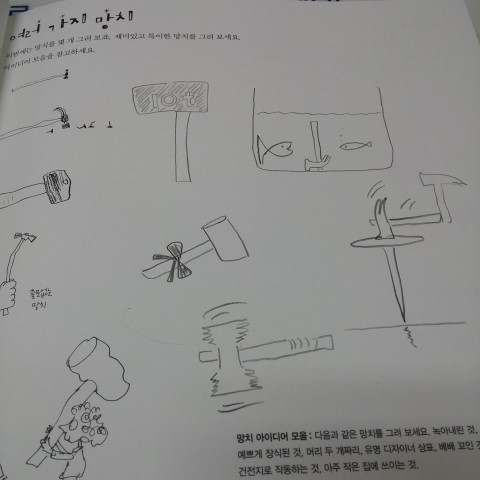 망치도 그려본다. 책의 하단부에는 '아이디어 모음' 이라는 나의 생각을 도와주는 문구들이 있다.
