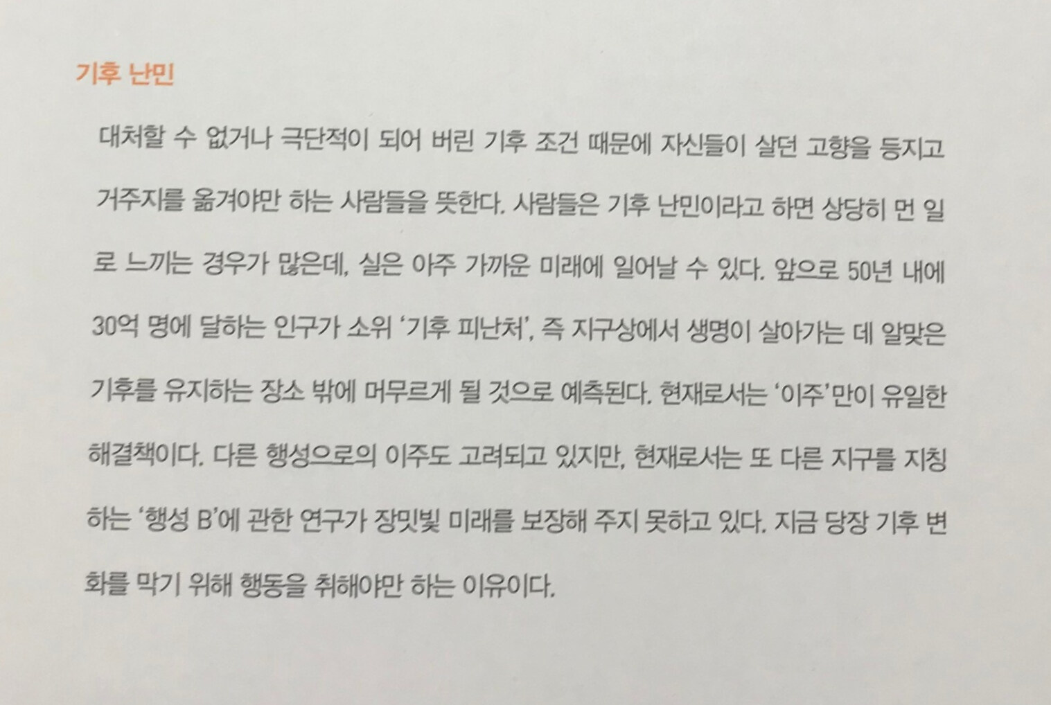 기후변화, 지구 온난화는 현재의 중요한 쟁점이며 왜 지구를 보존해야 하는지 다시한번 책을 읽으면서 느꼈다. 지구 온난화를 막기 위해서 우리는 온실가스의 발산을 감소시켜야 한다. 지금 내가 할수 있는 활동으로는 자동차 이용 줄이기 , 전기 아껴쓰기 , 재활용 분리수거 잘하기 , 비닐, 플라스틱 사용 줄이기 등이 있겠다. 책을 읽으면서 뭘 해야 할지 생각하기는 쉽지만 막상 실천하기는 쉽지 않다. 물 화 생 지 중에 물리를 가장 싫어했던 나로써는 쉽지만은 않은 청소년 대상 책이었고 잘 모르는 분야에 대해서는 청소년 책도 읽을만하다는 생각을 하게 되었다. 물리, 태양계, 기후변화에 관심이 있는 청소년이 과학을 더 잘 이해하기 위해서 읽어볼만 하다.