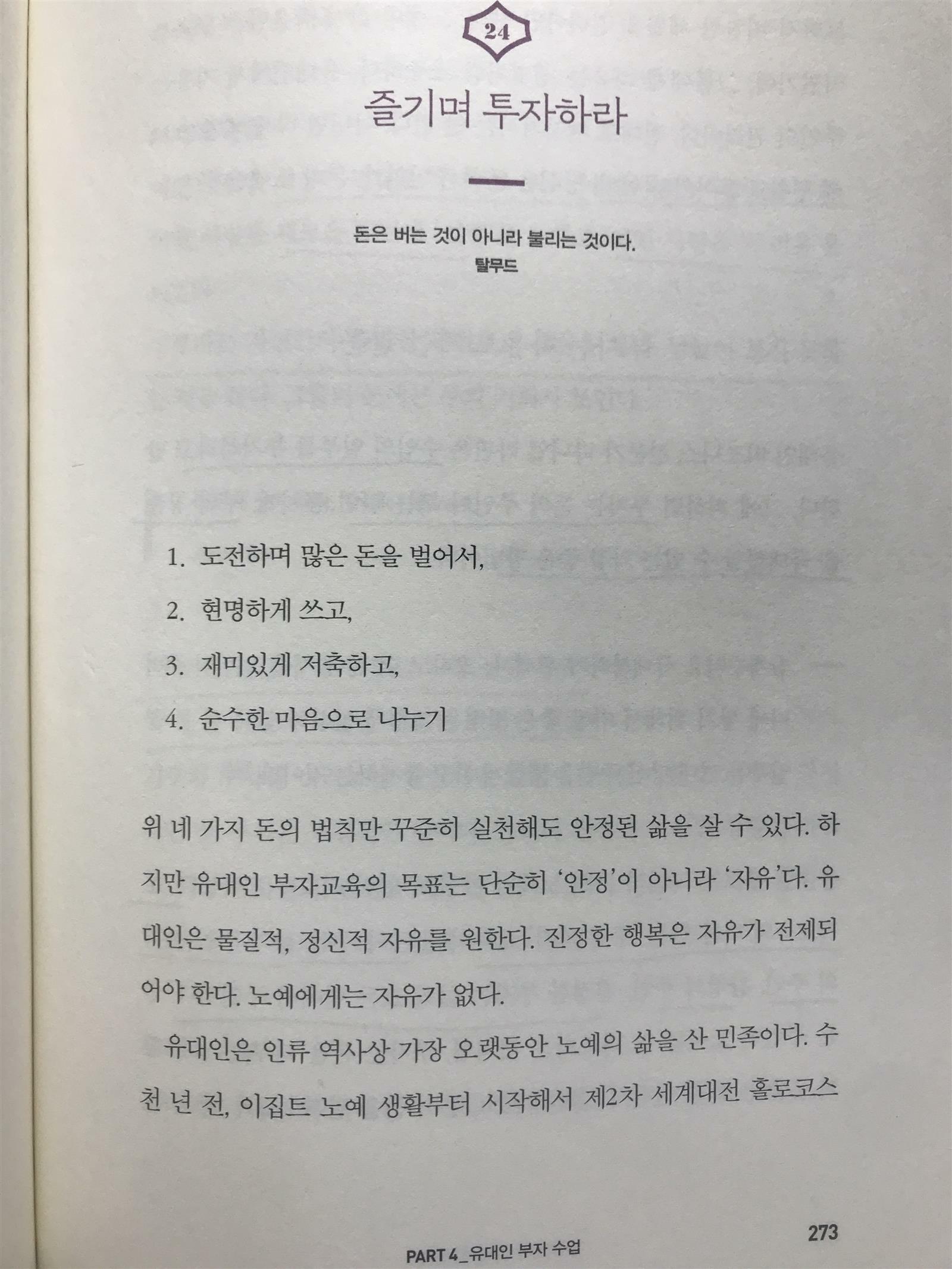 유대인은 투자가 기부와 같다고 생각한다. 유대인에게 투자는 선한 경제행위이다. 돈이 이동할수록 돈의 가치는 무한히 커진다. 돈의 흐름이 활발해질수록 부가 창출되고 더 나은 세상이 된다. 돈을 흘려보내는 투자야말로 기부와 같은 선한 행위라고 한다.