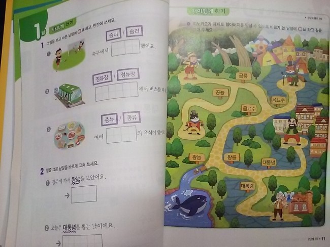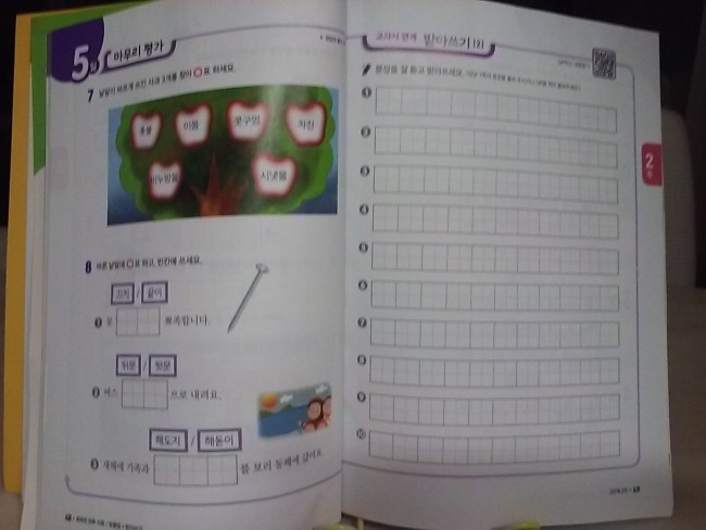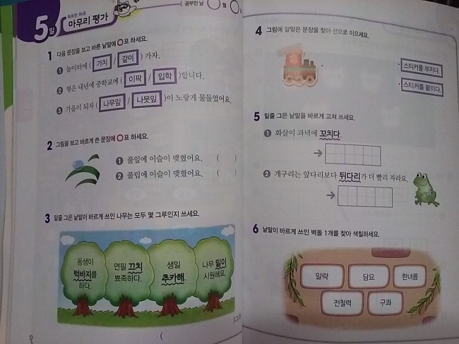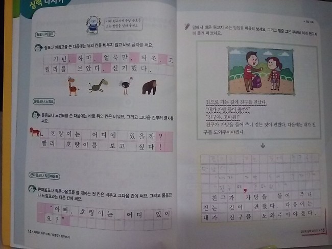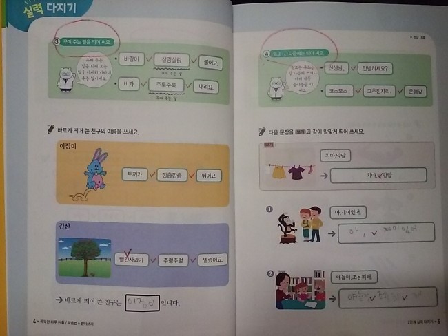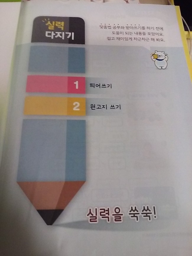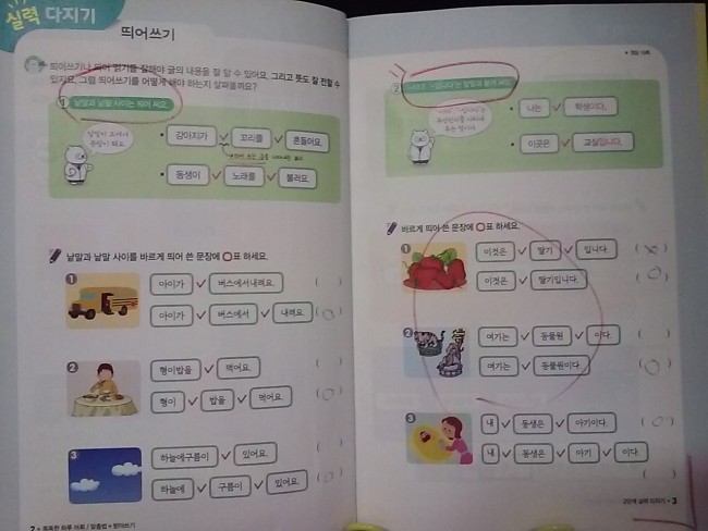책의 맨 앞에 있는 실력 다지기를 보면서 다시한번 띄어쓰기를 공부 해 봐요