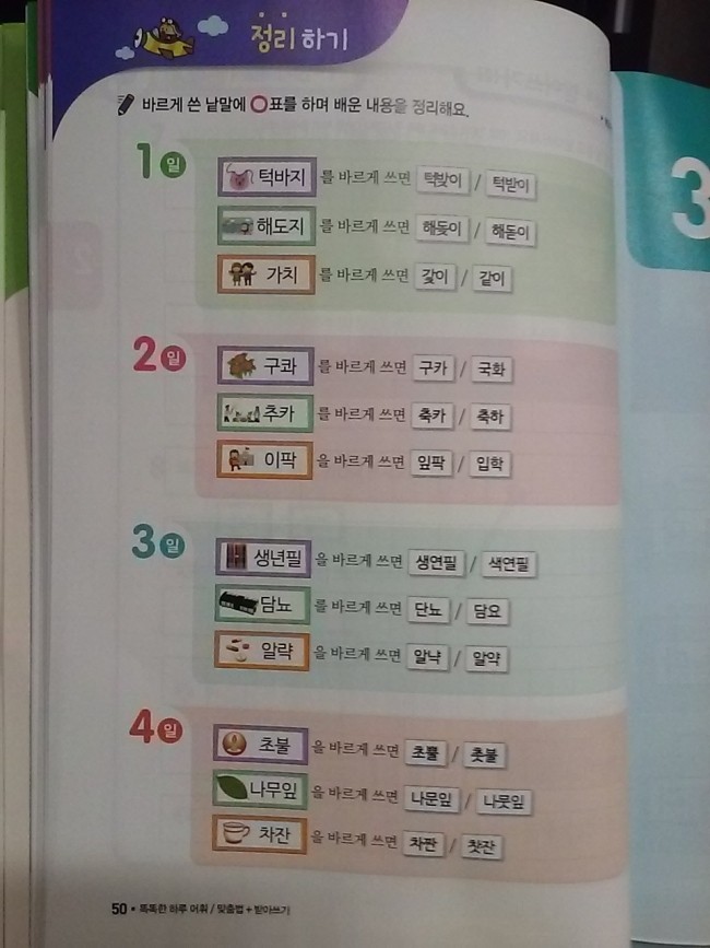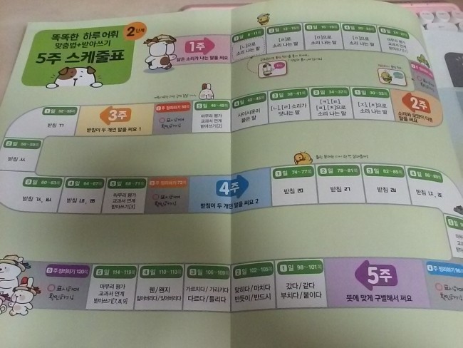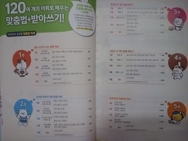 각 주별로 배우는 맞춤법과 받아쓰기 원리를 어휘 중심으로 정리가 되어 있어요