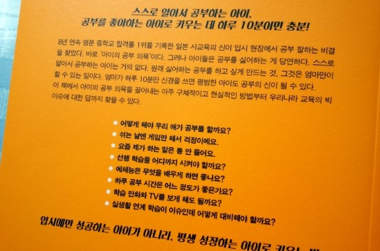 일본에서는 명문 사립 중학교에 입학하려면 입시를 거쳐야 한다네요. 장차 아이를 명문대에 입학 시키고자 하는 일본 엄마라면 당연히 첫 단추격인 명문 중학교에 입학 시키기 위해 초등학생 때부터 입시를 준비하겠네요. <하루 10분 엄마 습관>은 학원생들을 일본 내 유명 명문 중학교 합격 시켜서 합격율 1위로 유명해진 학원의 대표가 쓴 책입니다. 이 책이 일본 아마존 자녀교육 분야 베스트셀러가 된 건 어찌보면 아주 당연한 결과다 하겠습니다.
