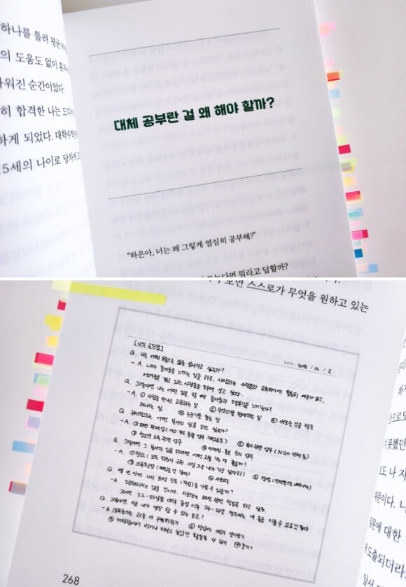 이 책을 다 읽자마자 간단한 후기를 곁들이면서 아이의 손으로 넘겨주었습니다. 책을 넘겨받은 아이의 첫 질문은 '구체적인 내용있어? 내가 공부하는 방법도 나와?' 였습니다. 저는 '응, 엄마가 공부했던 방법들도 나왔어. 엄마는 엄마가 똑똑한 줄 알았는데, 그냥 운이 좋아서 다른 친구들보다 공부법을 빨리 터득한거였어.'