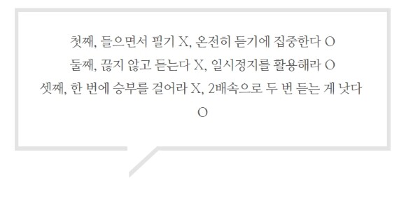 속청공부법을 활용하면서 시간을 아끼고 싶은 마음에 잘 듣지 못하거나 이해가 가지 않더라도 우선 대충 넘기려는 마음이 들 수 있다. 하지만 이는 오히려 비효율적인 결과를 낳게 되므로, 필요할 때는 잠시 멈추어 숨을 고르는 과정도 필요하다. p143
