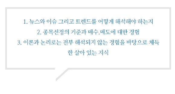 글로벌 경제정보가 실시간으로 전달되는 상황에서는 그 정보는 '어떻게 해석하느냐'가 더 중요해졌습니다. 정보는 공개되는 순간 주가에 반영되기 시작하고 투자자로의 개입은 이미 늦은경우가 많습니다. 그러므로 뉴스가 영향을 미치는, 보이지 않는 어떤 것을 찾아내는 판단력과 이 정보가 향후 어떤 흐름과 영향을 줄 것인지에 대한 상상력이 중요해졌습니다.