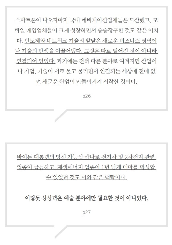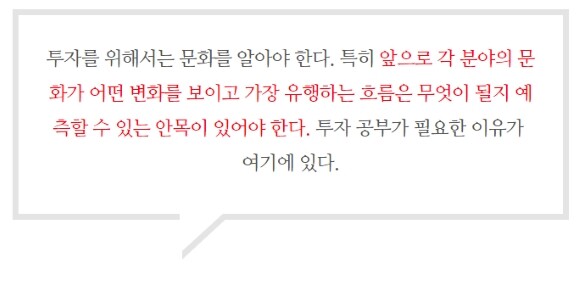 저자의 경험을 일부 녹아낸 사례를 보면, 종목을 발굴하는 상상력은 멀리 있는것이 아니라 주변에 대한 관심으로부터 시작함을 알 수 있습니다. 조금만 더 뉴스와 정보 그리고 주변환경에 관심을 갖고 생각하는 연습이 필요합니다.