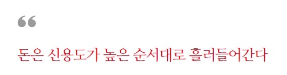 현대 자본주의 경제는 신용화폐 시스템을 근거로 운용됩니다. 신용화폐는 신용을 기반으로 하는 부채에 의존하고 있습니다. 그러므로 돈이 늘어나기 위해서는 누군가가 은행에서 대출을 받아야 하고, 대출이 많아져야 통화량이 늘어납니다. 대출을 위해서는 신용도가 높아야하며 그렇기에 돈은 신용도가 높은 순서대로 흘러갑니다.