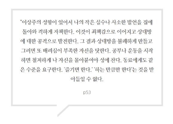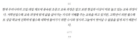 책을 읽고 있으면 답답함이 계속 올라옵니다. 현실적인 문제가 무엇인지는 알지만 쉽게 바꿀 수 없는 사회적인 부분이 존재합니다. 백년지대계가 아닌 일년지대계가 되어버린 교육정책으로 답답함은 더 증가됩니다. 현실과 계속 엇박자가 나고 있으며, 미래교육이 아니라 지금의 교육상황을 땜질형식으로 계속 굳건히 하는듯한 느낌도 있습니다. 바꿀 수 없는건지, 바꿀의지가 없는건지 솔직히 좀 헷갈립니다.
