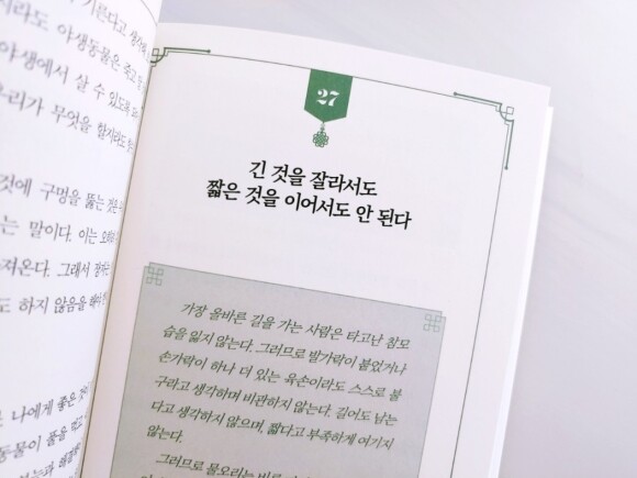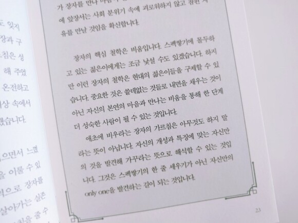 인생에 정해진 답은 없습니다. 하지만 자신의 삶에 대해서 깊이 생각해보고 노력해보고 방향성을 정해갈 수는 있습니다. 장자의 비움공부는 없어도 될 것들 자만심, 욕심, 탐욕 뿐만 아니라 자신에 대한 실망까지도 내려놓고 비우기를 권합니다. 세상에 쓸모없는 존재는 없다고 장자는 이야기합니다. 그리고 단점은 언제든 장점이 될 수 있다고도 합니다. 장자의 가르침은 큰 무언가가 되지않으면 이 세상에 쓸모없는 존재라는 듯이 다그치는 세상속에서 지쳐있다면 더 용기가 될 수 있는 글들입니다.