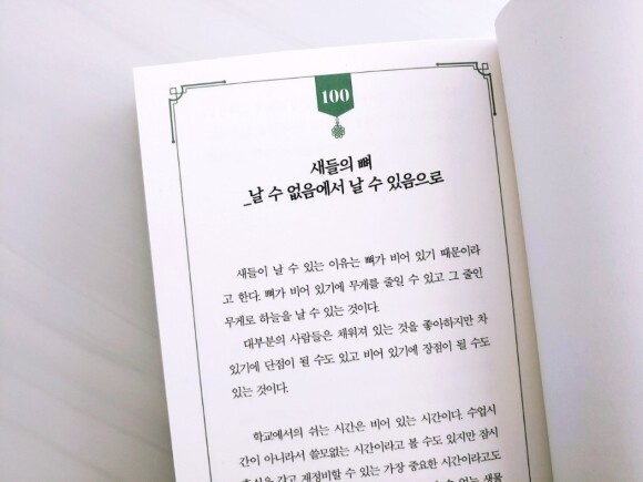 새들이 날 수 있는 이유는 뼈가 비어 있기 때문이라고 한다. 뼈가 비어 있기에 무게를 줄일 수 있고 그 줄인 무게로 하늘을 날 수 있는 것이다. 대부분의 사람들은 채워져 있는 것을 좋아하지만 차있기에 단점이 될 수도 있고 비어 있기에 장점이 될 수도 있는 것이다.