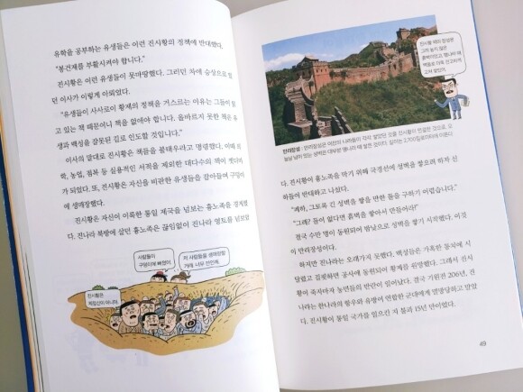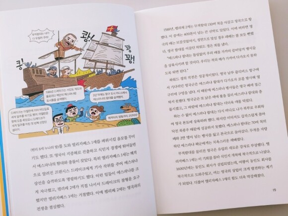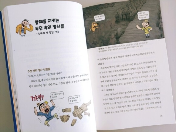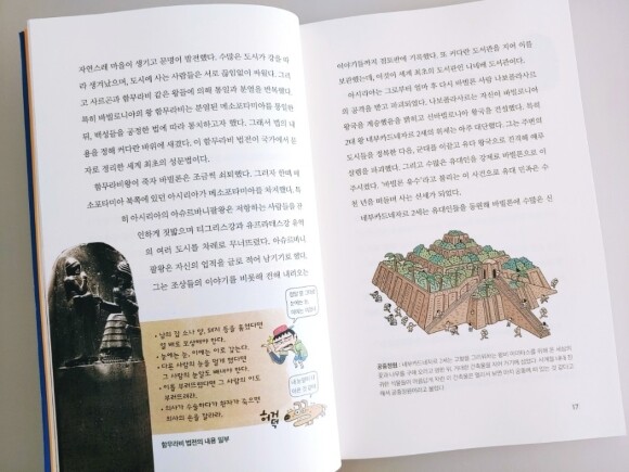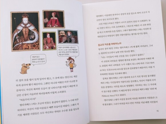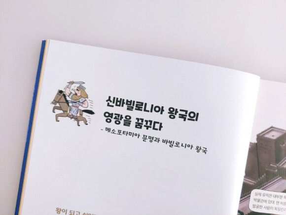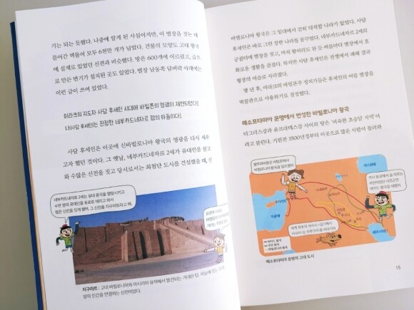 책의 구성들을 보면은 딱딱한 지식책이 아니라 호기심을 자극할 만한 이야기들과 일러스트 그리고 사진들로 구성되어져 있습니다. 그리고 내용도 너무 많은 지식을 담고 전달하는데 초점을 맞추기보다 처음으로 세계사를 접하는 친구들에게 있어서 세계사에 대한 부담감을 낮춰주는 형태로 진행되고 있습니다.
