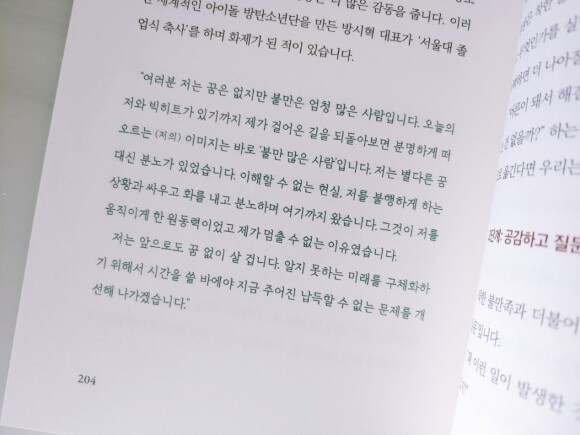 우리는 누구나 사회나 환경 모든것에 대해서 불평, 불만을 가집니다. 그속에서 개선점을 찾아나가는 행동의 시작을 하는 사람과 하지않는사람으로 나눠집니다. 그동안의 불평불만을 나쁘게만 생각할 게 아니라 조금은 방시혁대표의 말처럼 생각해보는것은 어떨까 싶기도 합니다.