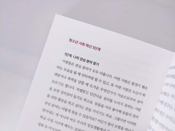 이 책은 1부, 2부, 3부 로 나눠집니다. 1부에서는 10대 33명의 이야기들이 담겨져 있습니다. 2부에서는 내 안에서부터 시작되는 변화의 시작이라고 할 수 있는 부분이 담겨져 있습니다. 그리고 3부에서는 세상을 혁신하는 방법에 대해서 다루고 있습니다.