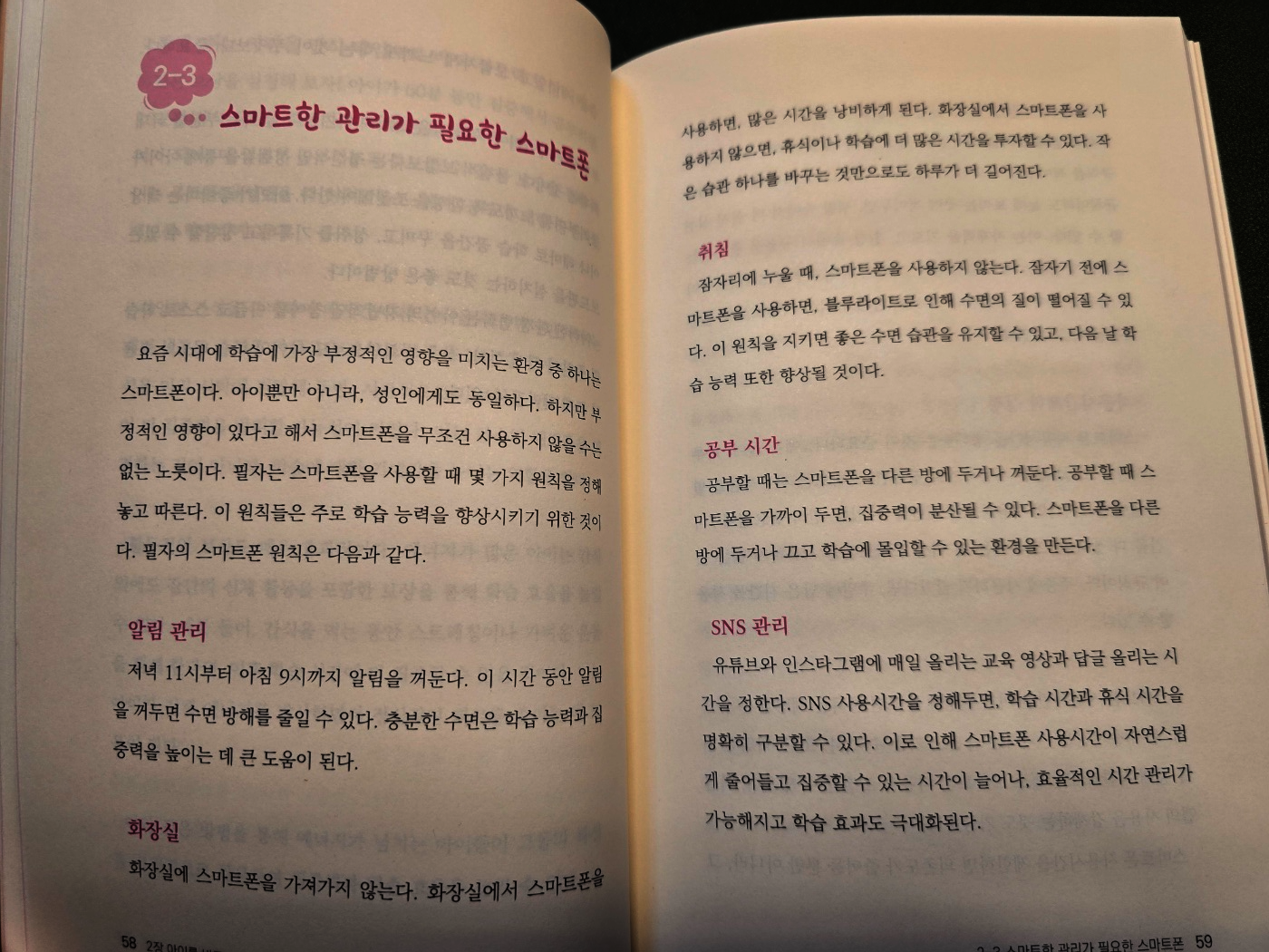 목표가 구체적일수록 아이가 학습접근성이 높으며 실질적인 계획을 세우고 아이 성향에 맞춰 꾸준히 실천해가야 함을 강조하고 있다. 학습환경은 아이의 성과를 좌우하는 결정적 요소로 아이가 공부할수 있도록 최적화된 공간과 공부리듬에 방해하지 않도록 가족들이 돕는 방법에 대해서 설명하고 있는데 스마트폰과 티비 제한이 우선이 될듯하다.