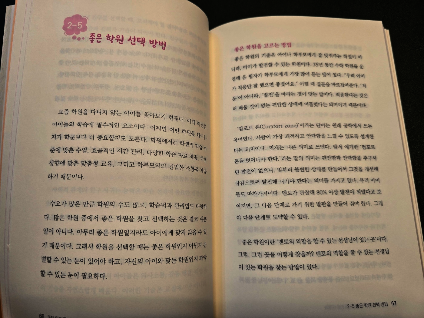 25년 경력의 학원 원장님의 경력을 바탕으로 학원과 관련된 이야기도 사뭇 와닿았는데.. 큰 아이같은 경우 학원에 좀 맹신하는 타입이고 자기주도가 안되는것 같아.. 아쉽긴 하지만 학원을 고르고 활용하고 학원에 갈때 질문할 사항에 대해서도 잘 서술해서 활용할수 있을거 같다