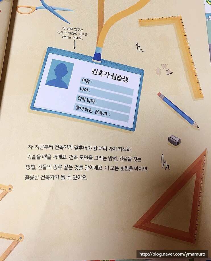 이책은 아이들의 흥미도를 자극하기 위해서 하나하나의 임무를 완수해서 마지막에 건축가 자격증을 주는 형식으로 되어있답니다.