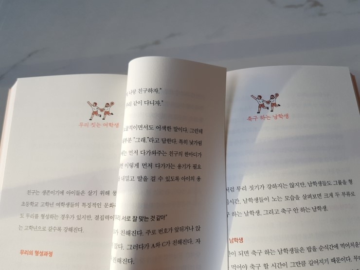 여학생과 남학생, 친구관계의 특징을 각각 '무리짓는 여학생'과 '축구하는 남학생'으로 표현하고 있는데요.