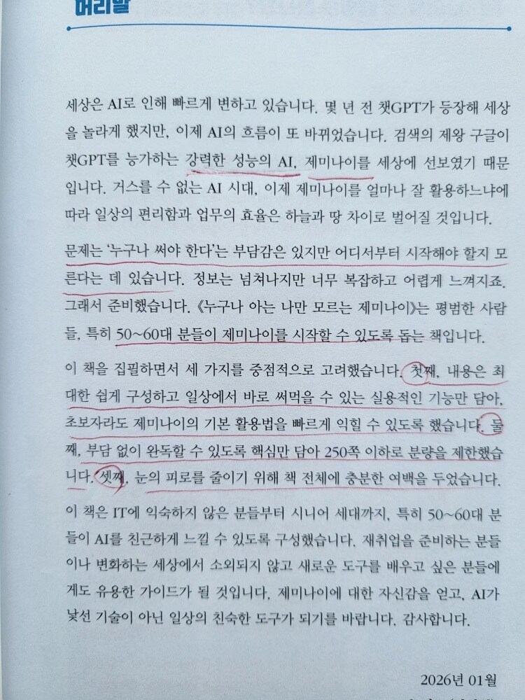 나는 책의 제목처럼, 가끔 세상의 변화에서 나만 뒤처지는 것은 아닐까 하는 막연한 불안을 느낄 때가 많았다. 하지만 저자는 제미나이를 다루는 핵심은 기술력이 아니라 '어떤 질문을 던지느냐'라는 인간의 사고력에 있다고 말한다. 평생 쌓아온 삶의 지혜와 연륜이 있는 시니어 세대야말로 AI에게 가장 깊이 있고 본질적인 질문을 던질 수 있는 적임자라는 격려는 큰 울림을 준다. 이 책은 기술을 배우는 법을 넘어, 기술을 통해 내 삶의 가치를 어떻게 확장할 것인지를 가르쳐준다.