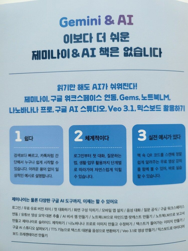 요즘 챗GPT와 재미나이를 모르면 바보가 되는 세상이 되었다. AI 종류도 다양하다. 처음에는 이런게 “70대 노인에게 왜 필요하겠는가” 라는 생각을 했다. 하지만 딸을 통해서 재미나이 설치부터 질문하는 법을 배우고 나니 재미가 있었다. 그러던 차에 이 책 <누구나 아는 나만 모르는 제미나이>를 읽게 되었다.
