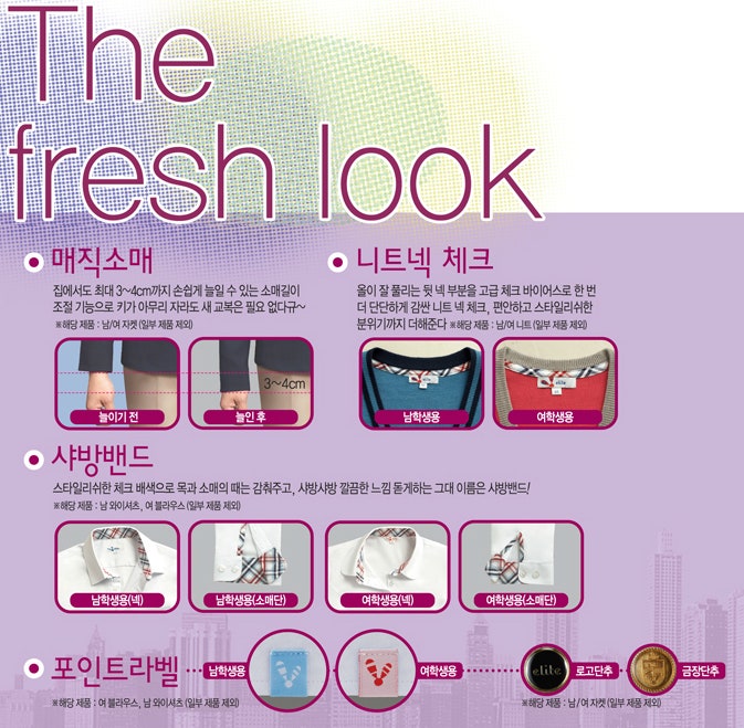 저희 딸은 중학교 3년내내 엘리트교복을 입었는데 끝까지 보풀없이 거의 새것처럼 입었답니다. 그런 경험때문에 이번 고등학교에 입학하여서도 엘리트 교복을 구입하려고 마음 먹게 되었답니다. 심플하여 날씬해 보이면서도 활동적이고 편안한 점을 저희 딸은 가장 만족스러워 한답니다.