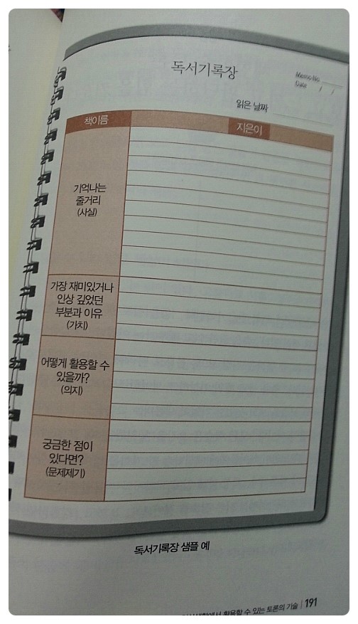 독서기록장 샘플예를 보여준다