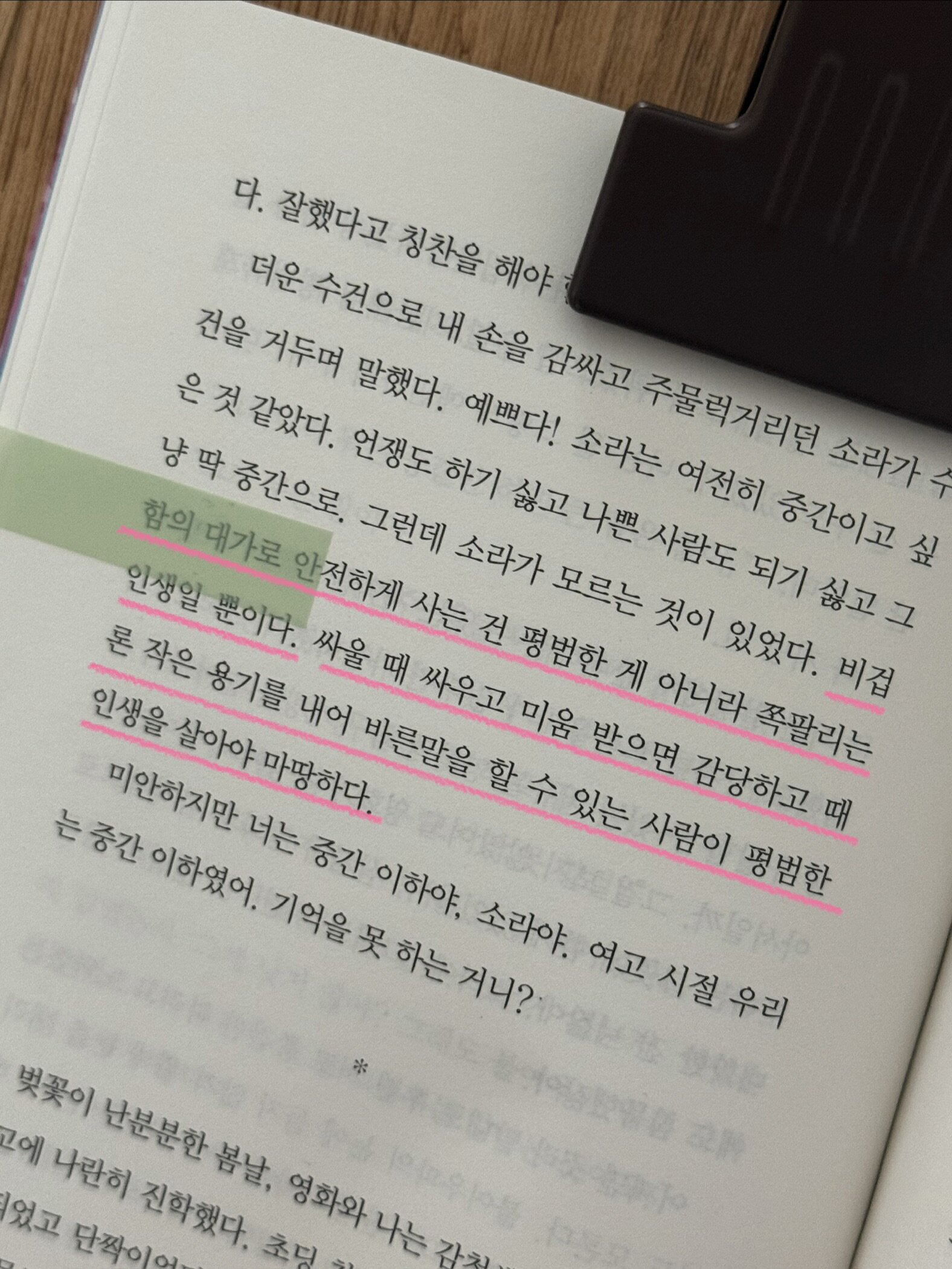 비겁함의 대가로 안전하게 사는 건 평범한 게 아니라 쪽팔리는 인생일 뿐이다. 싸울 때 싸우고 미움 받으면 감당하고 때론 작은 용기를 내어 바른말을 할 수 있는 사람이 평범한 인생을 살아야 마땅하다. ------ p.68