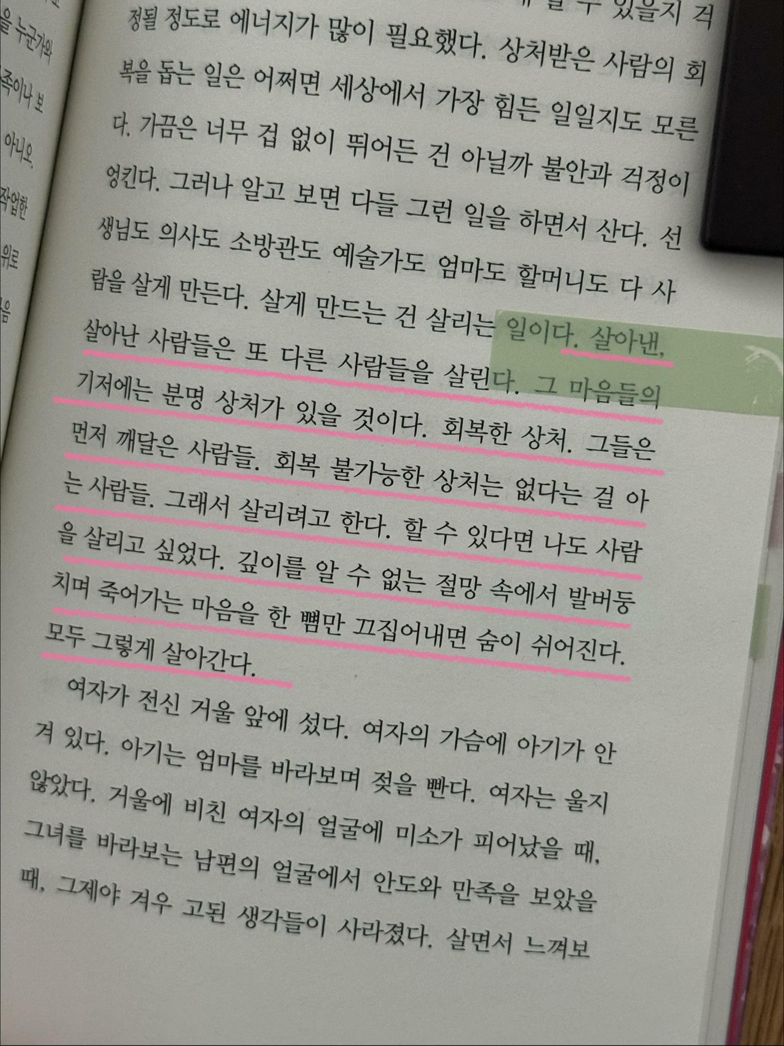 살아낸, 살아난 사람들은 또 다른 사람들을 살린다. 그 마음들의 기저에는 분명 상처가 있을 것이다. 회복한 상처. 그들은 먼저 깨달은 사람들. 회복 불가능한 상처는 없다는 걸 아는 사람들. 그래서 살리려고 한다. ------ p.181