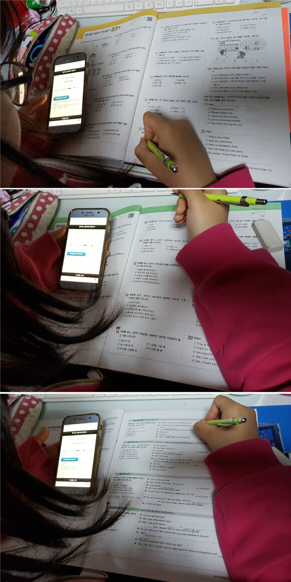 QR코드를 열심히 찍어가며 듣기평가를 하네요.