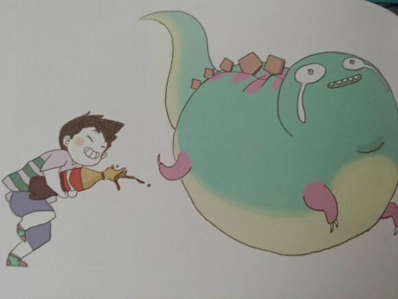 용용이가 뼈도 녹인다는 콜라를 흔든뒤 누나로 변신한 공룡에게 마구 뿌리지요.