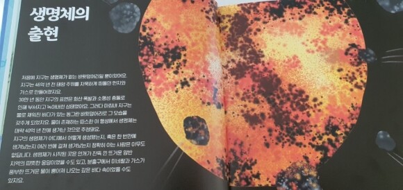 <진화가 뭐예요?> 생명체의 출현 처음에 지구는 바윗덩어리로 태양 주위를 자욱하게 떠돌던 먼지와 가스로 만들어졌고 물로 채워진 바다가 있는 지구로 변하면서 생명체가 생겨났다고 추정한다.