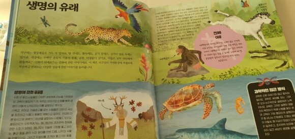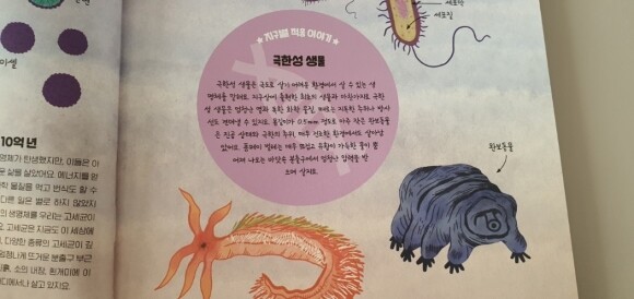완보동물,폼ㅍ이벌레 등의 극한성 생물은 지구가 얼마나 어려운 환경을 여러번 겪어냈는지 알려준다. <진화가 뭐예요?> 그림으로 먼저 만나고 설명을 통해 쉽게 생명에 대한 이해를 할 수 있게 한 책으로 아이가 참 좋아한다. |