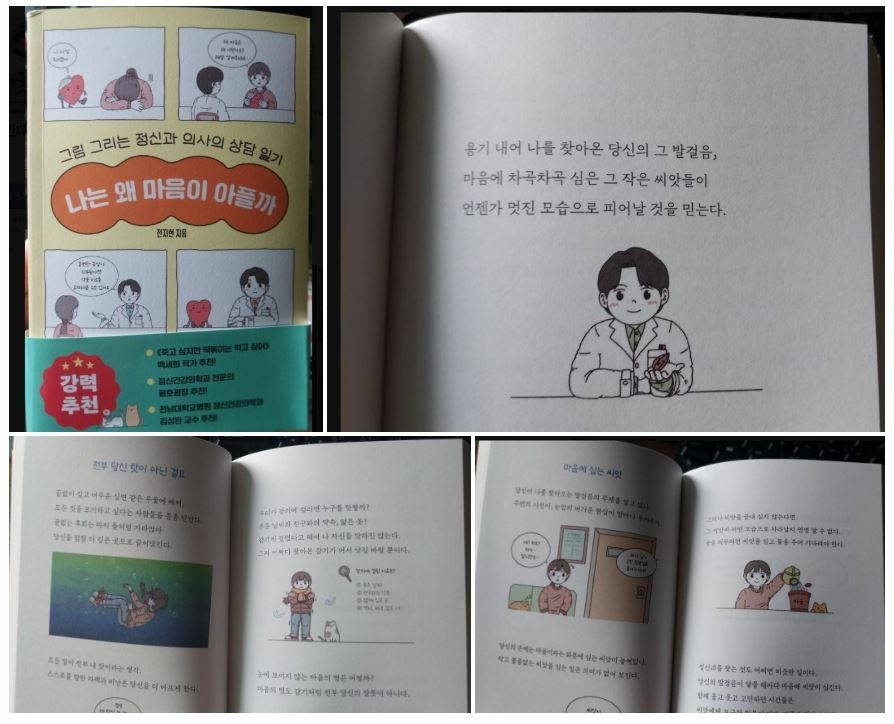 [나는 왜 마음이 아플까]에서는 환자의 마음 상태를 먼저 파악하고 건강하게 치유하는 방법을- 대인관계가 어려운 사람에겐 상황에 처한 우선순위를 정해보고 대처 해보는것과 과거의 실패와 두려운 기억들에 의한 편향된 생각 부정적인 자동사고를 전환시키는 노력과 함께 병원치료를 같이 한다면 두려움을 이겨낼수 있는 기틀이 마련되어 굳건해 질수 있다. -정답이 아닌것들을 삽을 붙잡고 있는것과 구덩이에서 벗어날수 있는 사다리를 찾아야 하는 것 어떤 방법이 건강한 삶을 영위하게될지 친절한 정신과 의사샘이 재미난 일러스트와 함께 세세히 설명하고 있다 만만치 않는 세상, 무거운 나의 이야기를 들어줄 누군가가 있다는 것 또한 큰 힘이 되어 줄것이다.