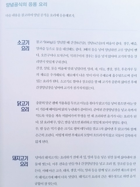 2장에서는 본격적으로 양념공식을 하나씩 살펴봅니다. 만능양념장, 곁들이는 양념장, 조리할 때 시간을 단축시켜주고 편하게 조리할 수 있게 해주는 조리용 양념장, 그리고 샐러드 소스와 김치양념 등 수많은 형태와 목적의 양념장을 만드는 비법을 알려줍니다. 간략하게 양념의 재료와 비율을 소개하고, 간략하게 만드는 법을 알려줍니다. 대부분이 양념을 비율대로 혼합하면 되는 것들이라서 만드는 법이 크게 어렵지는 않습니다. 그리고 그 양념장을 만들 때 주의해야 하는 내용들을 따로 마지막에 적어놓아서 실패하지 않고 맛있게 만들 수 있게 팁을 제공하고 있습니다. 흔히 초보들이 실패하는 이유가 만들라는대로 따라했는데 왜 맛이 없지? 이런 고민을 많이 하는데 만드는 과정 속에서 주의할 것들이 세세하게 많이 있는데 그런 것들을 자세히 말해주지 않으면 재료와 과정은 똑같지만 맛은 없어지잖아요. 그래서 만드는 과정이나 재료 준비 과정에 있어서 주의할 사항들을 꼼꼼하게 알려줘서 맛있는 양념장을 만들 수 있게 지도해주고 있습니다. 또 재료를 바꿔서 약간 다른 맛을 낸다거나, 자신의 입맛에 맞게 재료 조절하는 법도 알려줘서 나에게 가장 잘 맞는 비율을 찾을 수 있게 도와줍니다.