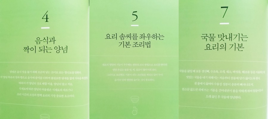 마지막으로 6장에서는 가족의 영양을 책임지는 건강요리를 만드는데 온 가족이 즐기는 명절 요리와 건강을 위한 전통요리를 만들어봅니다. 평소 집에서는 만들어보지 않았던 메뉴들이 대부분이라 항상 사먹기만 하던 것들을 집에서 직접 만들어보는 것도 의미있을 것 같네요. 특히 어른들이 좋아할만한 메뉴들이라 부모님들께 대접하면 아주 좋아하실 것 같아요.