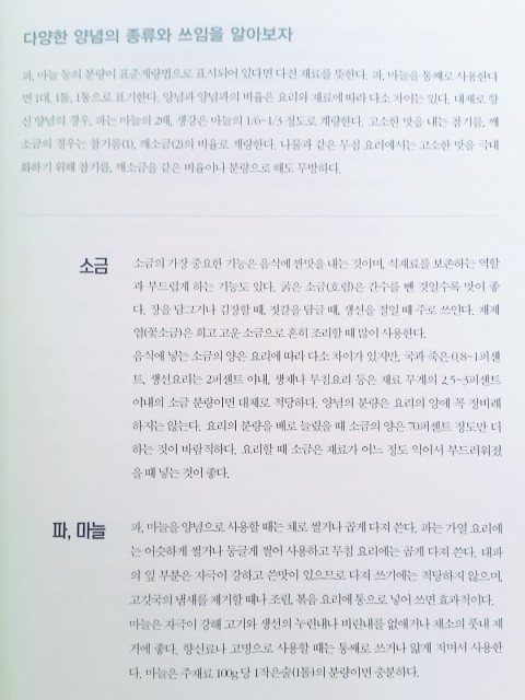 그중 가장 신선했던 것은 눈대중, 손대중, 말대중으로 계량하기라는 계량법에 대한 설명이었습니다. 요리에 익숙하지 않은 사람은 이 계량하는 것이 의외로 굉장히 힘들어요. 책이나 블로그에서 레시피를 보며 요리를 할 때 거기 소개되어있는 계량 용어가 정확히 어느정도라는 건지 감이 안와서 정말 난감할 때가 많습니다. 책에 소개된 것처럼 1/8~1/4작은술, 후추 약간, 참기름 1~2방울. 이런 것들은 도무지 어느 정도라는 건지 상상도 안됩니다. 계량하는 방식도 직관적으로 대충 어느정도라는 식으로 말을 할 때는 고민을 거듭하다가 결국 내 마음대로 넣게 되고, 맛 밸런스를 파괴시키게 되죠. 이런 어림짐작으로 아사모사하게 말하는 계량법을 표준화시키고 기준을 잡아주고 있어서 어느 정도 이해가 됩니다.