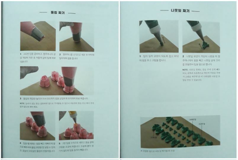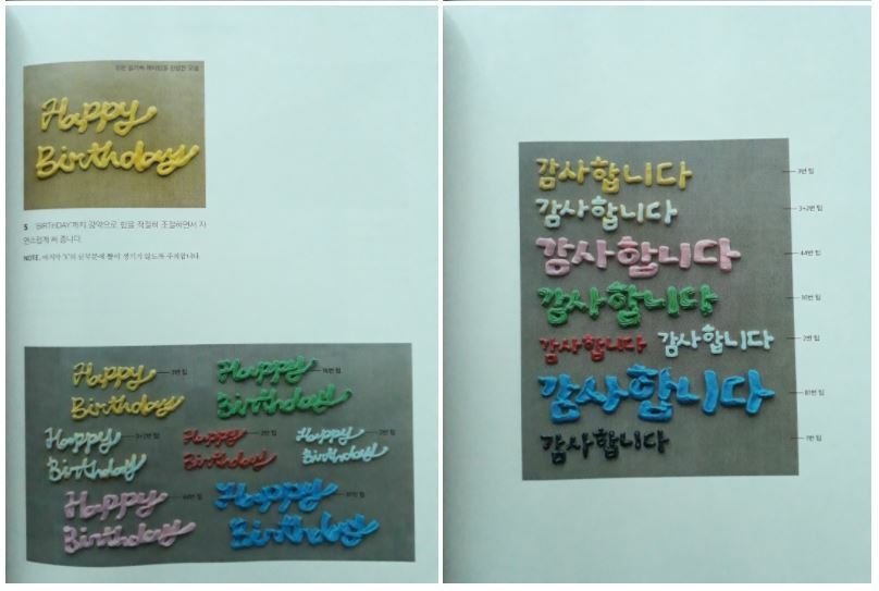 또 케이크의 위와 옆면에 팁으로 데코레이션을 하는 방법도 자세히 알려주는데 팁의 종류도 굉장히 많고 만들 수 있는 모양도 다양하더라구요. 프랜차이즈 매장에서 판매되는 케이크의 파이핑은 몇 가지로 정해져있는데 책에서는 다양한 팁으로 파이핑 하는 법을 상세히 알려주고 있어서 연습을 많이 해서 원하는 모양을 만들어보면 좋을 것 같아요. 그리고 글자를 쓰는 레터링 기법에 대해서도 알려주고 있어서 파이핑과 레터링을 연습해서 독창적인 케이크를 만들어 볼 수 있을 것 같네요.