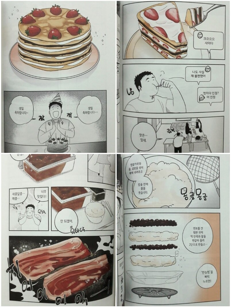 봉구의 음식은 소통과 사랑이다. 혼자 밥을 먹지만 자신이 밥 먹는 것을 봐주는 사람들이 있다. 혼자지만 혼자가 아니다. 나중에는 기묘한 인연으로 얽힌 사람들이 하나 둘 와서 함께 밥을 먹게 된다. 언제나 혼자인 봉구지만 적어도 밥을 먹는 순간 만은 누군가와 함께 있다. 그게 모니터 너머의 사람이건 실제 사람이건 어쨌건 자신과 얘기하고 봉구의 말에 귀 기울여주는 사람이 있는 것이다. 봉구에게 음식을 먹는 행위는 누군가와 대화하고, 속마음을 나누고, 사랑을 전하는 행동이며 음식은 세상과 연결된 유일한 통로다. 그래서 책은 모두 흑백이지만 음식 그림만 컬러로 되어 있다. 마치 사랑하는 사람을 앞에 두고 얼굴에 홍조가 생기듯 삭막하고 단조로운 색을 한 세상에 살고 있는 봉구의 음식들만은 세상의 빛을 찾아간다. 특히 컬러로 그려진 음식의 묘사는 디테일하고 색감도 좋아서 굉장히 먹음직스럽게 보인다.