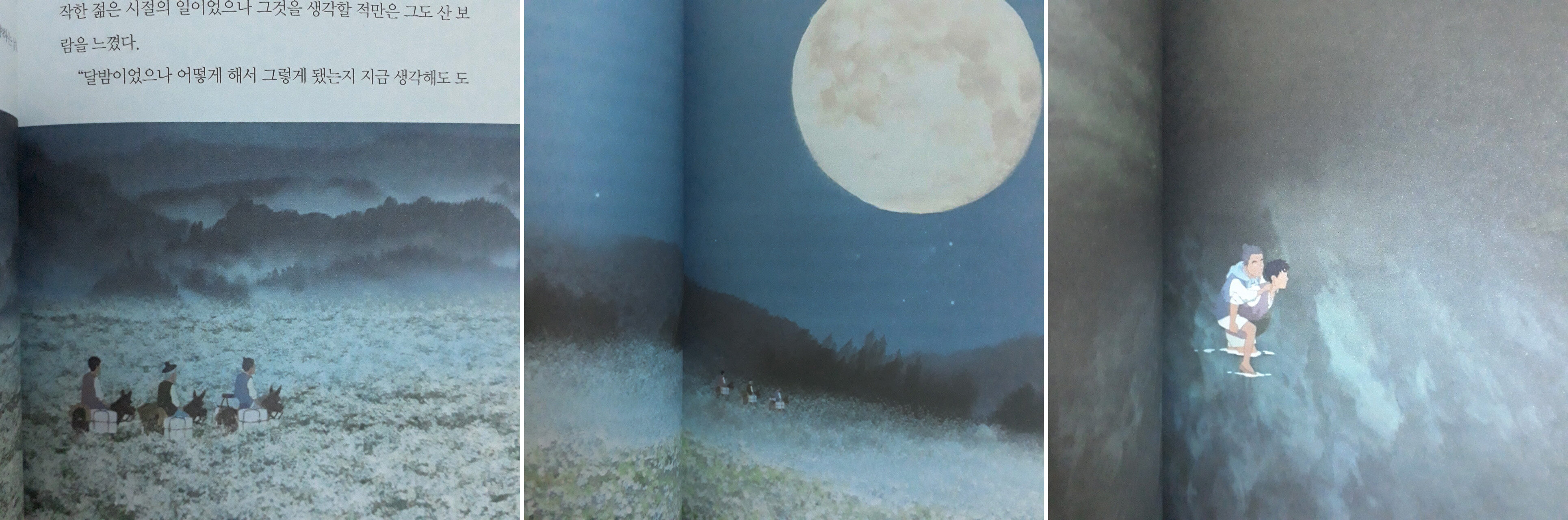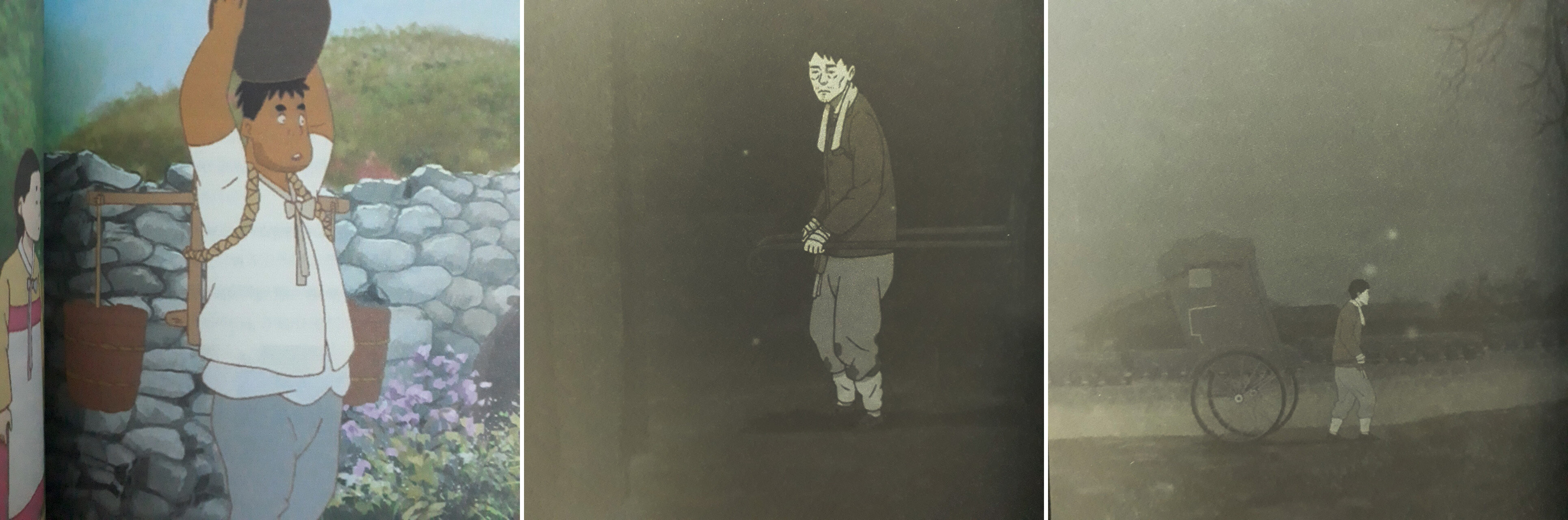 텍스트로만 된 책으로 글을 읽으려면 조금 지루해질 수도 있는데 멋진 애니메이션 원화와 함께 글을 읽으니 지루하지도 않고, 재미있게 글을 읽을 수가 있네요. 특히 넓게 펼쳐진 자연의 풍경들은 마치 내가 이야기가 펼쳐지는 그 곳에 함께 있다는 생각을 불러일으켜서 스토리 속에 들어가 있는 착각을 하게 만들 정도로 좋았습니다. 봄봄의 코믹한 장면들은 더 크게 웃음을 불러일으키고, 메밀꽃 필 무렵에서는 달밤의 메밀꽃밭이 환상처럼 피어올라서 아련함을 느끼게 해줬구요. 그런데 운수 좋은 날에서의 마지막 장면은 오히려 슬픈 감정이 폭발해야 하는데 애니메이션의 묘사 수준으로 감정이 한정된다는 느낌이 들었어요. 정말 슬픈 장면이라 만약 애니장면이 없었다면 머리 속으로 상상할 수 있는 가장 슬픈 장면을 떠올리며 감정을 폭발시켰을건데 애니 사진을 보니 딱 거기 묘사된 수준으로만 상상이 한정되어버린 것 같았습니다.